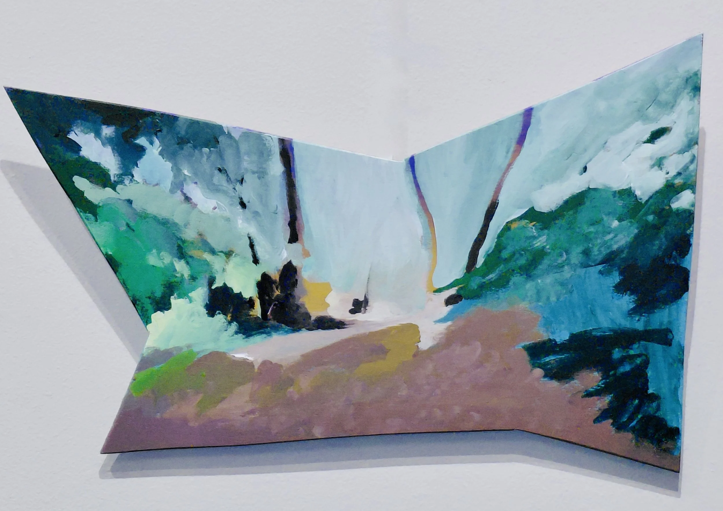 Artist Ben Bradshaw’s new exhibit, “SONG,” is a delight for the eyes and the imagination! Expect to see abstract art pieces painted on various different, multi-sided, irregular shapes – not square or rectangular. Ben builds his own canvases for larger works. Likewise, he makes unusually shaped custom wood panels for his smaller works. These shapes are an integral part of his unique art.
